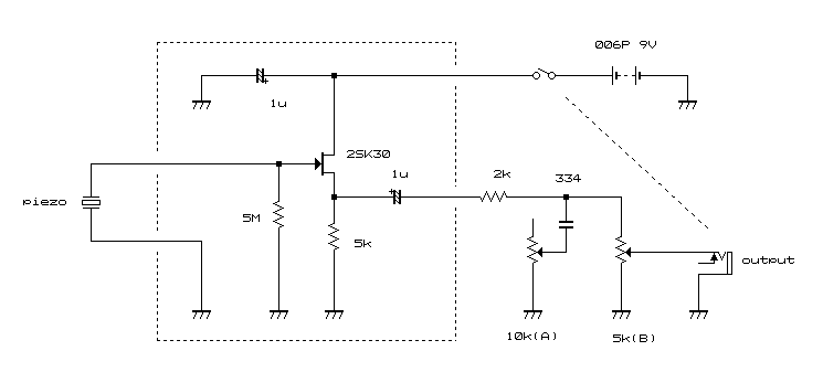 ![]() 内部回路です。・・そうか、500kΩという高いインピーダンスのまま外部に出すんだな。で、最近のミキサーは入力インピーダンスがそんなに高くないから、ピエゾだと高音域だけ残って、低音域が無くなる。んだな という事で、どんなアンプにも繋げる様にするには、インピーダンス変換の回路が必要という事だ |