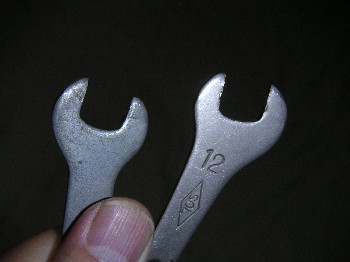 | そこで、精密な「内のりが12.6mm」の スパナを2本作る 写真のような安っぽい12mmくらいのスパナは そこら辺に転がってるでしょ。 この内側を少しづつサンダーで削り取る 角がダレてはいけない また、精密に仕上げる必要があるので ノギスを持っていない人はムリ |