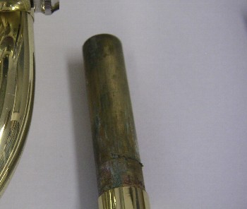 | 抜けたチューニング管の内管・・えらい汚い これを良く観察すると サビだけではない、グリスの古くなって けっこう硬いワックス状態 それに汚れ(タンパク質か?) それらが微妙に混ざり合って そう、古くなってカビが生えたチーズが 更に乾燥した状態だ どおりで熱湯で暖めた位じゃぁビクともしないワケだ |