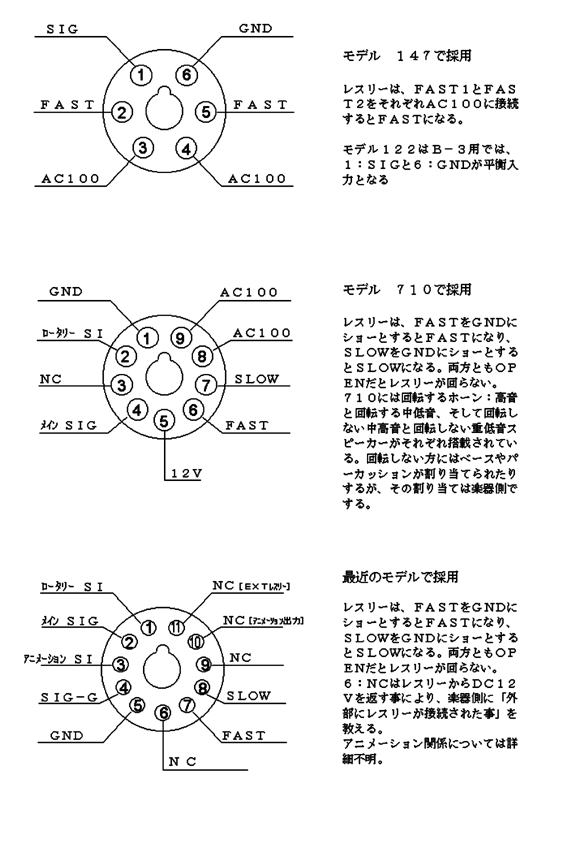 | レスリースピーカ各モデルの入力コネクタピンコネクション |